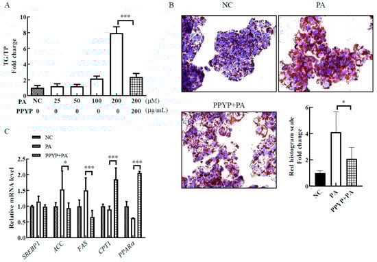 Effect of PPYP on triglyceride (TG) accumulation in PA-induced HepG2 cells. (A) TG content; (B) Oil red O staining; (C) lipid metabolism-related gene expression. Data are presented as mean ± SD from three independent experiments and significance is indicated using stars (*) relative to the comparative group with * p < 0.05 and *** p < 0.001.