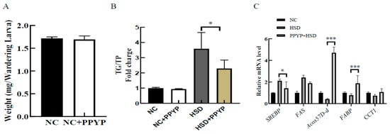 Effects of PPYP on high-sucrose-diet (HSD)-fed 3rd instar larvae. (A) Larval weight; (B) TG content; (C) lipid metabolism-related gene expression. Data are presented as mean ±SD from three independent experiments and significance is indicated using stars (*) relative to the comparative group with * p < 0.05 and *** p < 0.001.