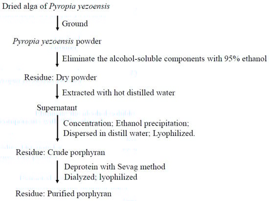 PYP extraction was performed with optimal extraction parameters (temperature: 100 °C, time: 120 min; liquid–solid ratio: 29.32 mL/g) and extraction process of PYP. The dried PYP was dissolved in distilled water (20 g/L), and the protein was removed using the Sevag method [59]. Then, the aqueous phase was collected, dialyzed, and lyophilized to powder, termed PPYP. The procedure for the extraction and optimization of purified porphyran is illustrated in Figure 7.