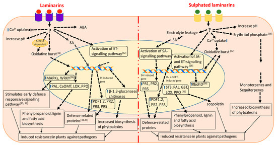 Schematic representation of the cellular functions and signalling pathways involved in defense mechanisms elicited in laminarin and sulphated laminarin. The drawing represents a synthesis of the work described by [28,31,32,33,34,35,38].