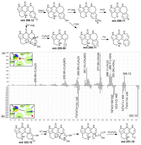MS2 spectra of the 306.1 Da (a), (annotated as discorhabdin I) and the rightmost 322.1 Da nodes (b), (annotated as an oxygenated discorhabdin I derivative) from group B and proposed key fragmentation mechanisms.
