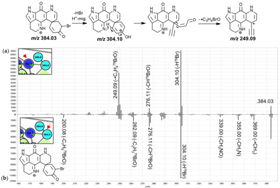 Inspection of the MS2 spectra of the 336.1 Da and the 414.0 Da nodes led to their annotation as the known discorhabdins G* and 2-bromodiscorhabdin D, respectively. For the 336.1 Da compound (Figure 6a), particularly abundant product ions were found at m/z 303.09, 286.09, and 274.09, possibly produced along the same fragmentation path and corresponding to neutral losses of •SH, H2SO and CH2SO, respectively. The odd-electron product ion at m/z 249.08 corresponded to neutral loss of •C3H3SO from the precursor ion. A putative fragmentation mechanism towards this product ion (C15H9N2O2+•, underestimated by −41 ppm; precursor at m/z 336.07 for C18H14N3O2S+ underestimated by −32 ppm) is proposed in Figure 6a, involving remote-hydrogen rearrangement, proton migration, β-hydrogen removal and homolytic cleavage. An odd-electron product ion corresponding to neutral loss of •SH was detected at m/z 303.09 and it is possible that the product ions at m/z 302.08 (-H2S), 286.09 (-H2SO), 275.10 (-•CHSO) and 274.09 (-CH2SO) originate along the same fragmentation channel as this m/z 303.09 product ion, hypothetically involving a dienone-phenol rearrangement as was proposed for putative discorhabdin I (Figure 3a).