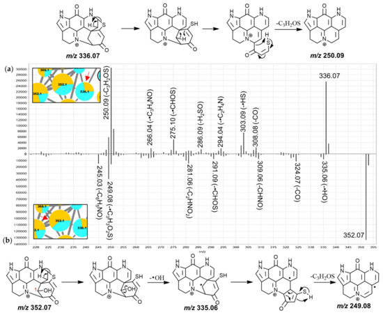 MS2 spectra of the 336.1 Da node (a), (annotated as discorhabdin D) and the right 352.1 Da node (b), (annotated as discorhabdin L) from group D and proposed key fragmentation mechanisms.