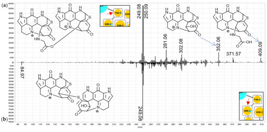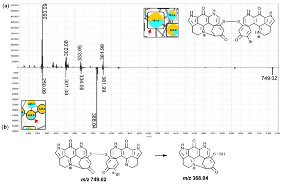 Group M in the molecular network is comprised of 23 nodes annotated as discorhabdin dimers linked by a disulfide bridge. These include four nodes of singly-charged ions, three of which were found to correspond to alternative charge-states of compounds also represented by nodes of doubly-charged ions (Figure 2, connected by dashed red lines). Disulfide-linked discorhabdins are exemplified in the known discorhabdin W [25] and the annotations as analogous compounds here were based on the observation of a m/z 368.04 fragment in the MS2 spectra of the nodes of the singly-charged ions at 745.0 and 747.0 Da. The m/z 250.09 fragments in the MS2 spectra of the doubly- and singly-charged precursors at 747.0 Da support their annotation as discorhabdins (Figure 12), while the m/z 368.04 for the singly-charged precursor (Figure 12b) suggested disulfide-linkage between the discorhabdin monomers, due to the fact that persulfides (R-S-SH) are known CID fragments of disulfide bonds [46,47]. In comparison to the similar mass compounds of group N, the MS2 spectra of the nodes of doubly-charged precursors in this group showed particularly abundant m/z 249.08/250.09 fragments with only low intensity at higher m/z values and most of the features were contributed to primarily by C. bellae samples.