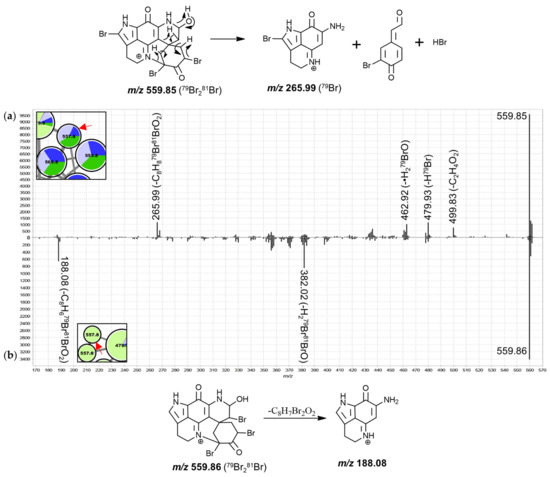 The features in group H were annotated as di- and tribrominated C-series discorhabdins, supported by previous reports of such discorhabdins from T. favus [18,19]. The product ion spectra of these features were dominated by fragments resulting from debrominations (Figure S3.14) and most features, especially those corresponding to tribrominated precursors, were primarily contributed to by T. favus and T. michaeli chemotypes I, as well as T. nguni. Interestingly, one feature, annotated as a dibrominated C-series discorhabdin, was contributed to by C. bellae and L. apicalis indicating that dibromination of discorhabdin monomers does occur in these sponges. T. michaeli chemotype II samples dominated contributions to the nodes annotated as dibrominated hydroxylated discorhabdins. Furthermore, two tribrominated features (557.8 Da) were exclusively detected in T. michaeli chemotype II with two isobaric features occurring in T. favus and T. michaeli chemotypes I and T. nguni. Noteworthy, the 557.8 Da features found in T. michaeli chemotype II compounds showed product ions at m/z 188.08 matching makaluvamine I, whereas the isobaric features present in T. favus and T. michaeli chemotypes I as well as T. nguni showed product ions at m/z 265.99 (Figure 9). This suggests that for the two features in T. michaeli chemotype II, tribromination may occur at the spiro-moiety without involving C-14.