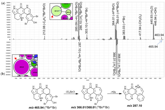 MS2 spectra of the large 461.9 Da node (a), 79Br81Br precursor, (annotated as 7,8-dehydro-3-dihydrodiscorhabdin C) and the 463.9 Da node (b), 79Br81Br precursor, (annotated as 3-dihydrodiscorhabdin C) from group J.
