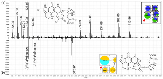 The MS2 spectrum of the 414.0 Da node showed a high-abundance fragment derived from neutral loss of C3H2OS at m/z 328.00 (matches m/z 250.09 fragment with bromine instead of hydrogen) prompting an annotation as a hexacyclic D-series discorhabdin for the precursor compound (Figure 6b). The molecular formula of this compound was identical to the known pentacyclic discorhabdin B, which has been reported to exhibit major CID-fragments at m/z 334 and 302 using an ion trap instrument [45]. A m/z 328.00 fragment was, however, not reported supporting the annotation here of a different isomer, namely 2-bromodiscorhabdin D, a pyrroloiminoquinone recently isolated for the first time from L. biformis [33]. The central 366.1 Da node was annotated as a new 2-methoxydiscorhabdin D while the 412.0 Da node was annotated as the known discorhabdin Q (Figure S3.9).