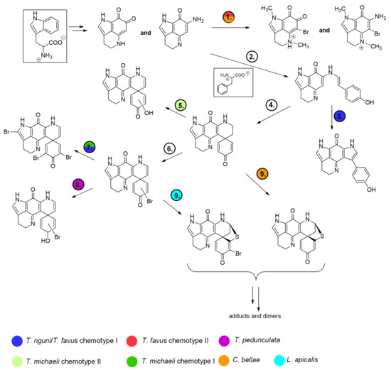 Proposed biosynthetic sequence illustrating the variability of pyrroloiminoquinone production in latrunculid sponges. Reactions that appear to be particularly prevalent in a sponge type according to annotations in the molecular network are indicated by color. 1. N-methylation and bromination of makaluvamines and damirones, 2. Formation of branched makaluvamines from unbranched makaluvamines under reaction with phenylalanine, 3. Condensation to tsitsikammamines, 4. Condensation to discorhabdins, 5. Hydroxylation, 6. Bromination, 7. Further bromination, 8. C-3 reduction, 9. Sulfur-insertion.