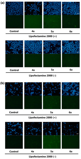 Microscopic images of HeLa cells (a) or P388 cells (b) treated with EtOH (control), 4a (negative control), 5a, and 6a with or without Lipofectamine 2000 for 2 h (green). Nuclei stained with Hoechst 33,342 (blue), magnification ×20, scale bar: 50 μm. The brightness and contrast were adjusted equally for all the green fluorescent images.