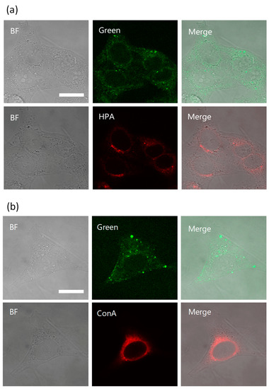 Co-localization study in HeLa cells. Confocal microscopic images of HeLa cells incubated with 5a in Lipofectamine 2000 for 2 h (green). After incubation with 5a (upper lane) for 2 h and the same cell stained with Lectin HPA (lower lane) (a). After incubation with 5a (upper lane) for 2 h and the same cell stained with concanavalin A (ConA) (lower lane) (b). Bright field (BF, left) and HPA (red, middle) or ConA (red, middle), and merged images (right). Golgi stained with HPA Alexa fluor 647 conjugate (red), endoplasmic reticulum stained with ConA Alexa fluor 594 conjugates (red) respectively, magnification ×100, scale bar: 20 μm. The brightness and contrast were equally adjusted for all the green fluorescent images. 5a was added to living cells for 2 h, fixed with 4% PFA, and fluorescent images were obtained (upper lane). Staining with Con A and HPA was performed after permeabilization of the fixed cells (lower lane).
