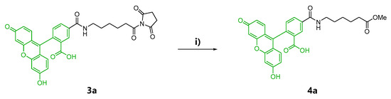4.2.1. Synthesis of 6-(Fluorescein-5-Carboxamido) Hexanoic Acid, Methyl Ester (5-FL-COOMe: 4a)