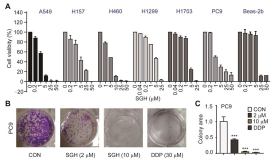 Lung cancer PC9 and H157 cells (500 cells/well) were treated with different concentrations (2–15 µM) of SGH or positive control drug cisplatin (DDP, 30 µM) [37] and inoculated in 6-well plates for 2 weeks. The treated-cells were washed with phosphate-buffered saline (PBS), fixed with 10% paraformaldehyde (PFA), and then stained with a solution of 0.1% crystal violet solution. After that, cell colonies were photographed, and area of each cell colony and total areas of all cell colonies were calculated by using Image J software (Version No. 1.4.3.67, National Institutes of Health, Bethesda, Maryland, USA). The SGH and DDP values were normalized to the control values and data are presented as the mean ± SD (n = 3, three independent experiments).
