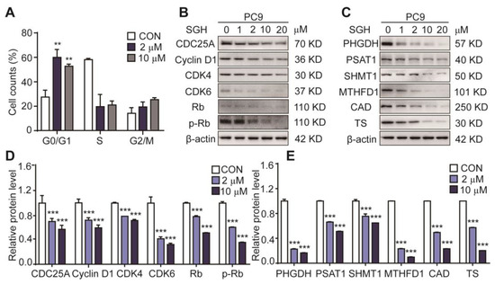 The G0/G1 phase of cell cycle is the early stage of DNA synthesis. Thus, we also assessed the effect of SGH on the expression of nucleotide synthesis-related proteins, including PHGDH and PSAT1 (two catalytic enzymes in the serine biosynthesis pathway), SHMT1 and MTHFD1 (two catalytic enzymes in the one-carbon metabolism pathway), CAD and TS (two catalytic enzymes in the nucleic acid synthesis pathway). The results (Figure 2C,E and Figure S5C,E) show that SGH at 2 µM for PC9 cells and 5 µM for H157 cells downregulated all six tested proteins after a 24 h treatment (*** p < 0.001). These data suggested that SGH can regulate cell cycle- and nucleotide synthesis-related proteins, thereby arrested cell cycle at G0/G1 phase in lung cancer cells.