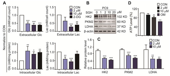 By following the manufacturer’s instructions, the glucose assay kit, lactate assay kit, and ATP assay kit were used to determine the levels of glucose, lactate, and ATP in PC9 and H157 cells treated by different concentrations of SGH or positive control agents 2-deoxyglucose (2-DG, 0.4 mM) and oligomycin (OM, 10 µM) for 24 h. The levels of glucose and lactate in SGH and 2-DG groups were normalized to those in control (CON) group, and before that, the extracellular and intracellular glucose and lactate levels were respectively normalized by cell count and mg protein.