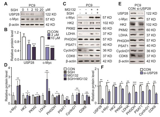 Streptoglutarimide H (SGH) downregulated USP28 and c-Myc, proteasome inhibitor MG132 reversed the downregulation of related proteins induced by SGH, and si-USP28 downregulated the cell cycle-, glycolysis-, and nucleotide synthesis-related regulators in PC9 cells. (A) Protein levels of USP28 and c-Myc in PC9 cells treated with different concentrations of SGH for 24 h. (B) Quantitative result of USP28 and c-Myc levels in Figure 4A. (C) Expressions of c-Myc, HK2, PKM2, LDHA, PHGDH, PSAT1, CDK6, and cyclin D1 in PC9 cells preincubated with MG132 (10 µM) for 2 h and then SGH (10 µM) for 6 h. (D) Quantitative results of the protein levels in Figure 4C. (E) Expressions of USP28, c-Myc, HK2, PKM2, LDHA, PHGDH, PSAT1, CDK6, and Cyclin D1 in PC9 cells after the application of 48 h with 20 pmol siRNA. (F) Quantitative results of the protein levels in Figure 4E. Data are presented as the mean ± SD (n = 3, three independent experiments), * p < 0.05, ** p < 0.01, *** p < 0.001 (SGH + MG132 vs. SGH or si-USP28 vs. CON) by students t-test.
