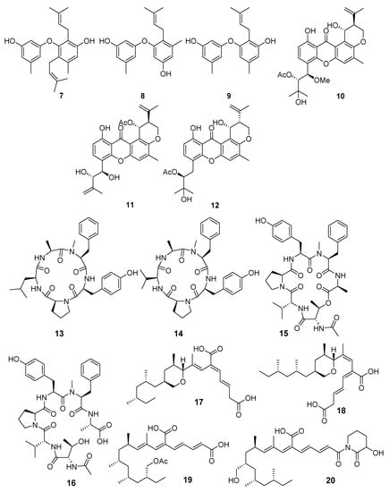 Since the isolation of penicillin, the antibacterial activity of metabolites of microfilamentous fungi has been the focus of investigations. Marine fungi are no exception in this sense. From 1998 to 2019, more than 270 compounds with antimicrobial properties were isolated from various marine-derived fungi [18].