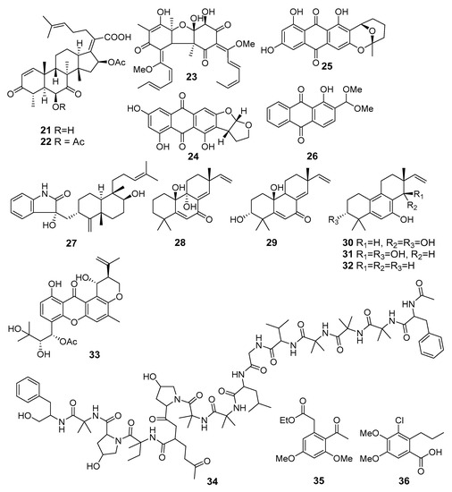 The antibacterial metabolites (21–36) of marine sediment-derived fungi.