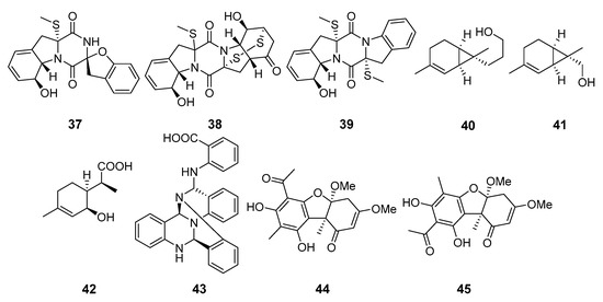 Two new benzoate derivatives, ethyl 3,5-dimethoxy-2-propionylbenzoate (35) and ethyl 3,5-dihydroxy-2-propionylbenzoate, and one new phenylacetate derivative, ethyl 3,5-dimethoxy-2-propionylphenylacetate, were isolated from Engyodontium album (the Pacific Ocean). Compound 35 exhibited inhibitory activities against MRSA and Vibrio vulnificus [32]. Moreover, engyodontiumin A (36), a new benzoic acid derivative, was isolated from this fungal strain and showed moderate antibacterial activity against MRSA, Vibrio vulnificus, V. rotiferianus, and V. campbellii, as well as antifungal activity against Aspergillius niger [33].