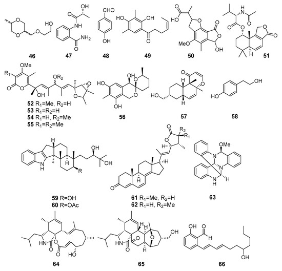 Known 2-[(5-methyl-1,4-dioxan-2-yl)methoxy]ethanol (46), 2-[(2R-hydroxypropanoyl)amino]benzamide (47), 4-hydroxybenzandehyde (48), and 2′,3′-dihydrosorbicillin (49) (Figure 5) were isolated from Penicillium sp. M30 strain (Con Co Island, the South China Sea). Compound 46 showed a strong inhibitory effect against Enterococcus faecalis, whereas both 47 and 48 selectively inhibited Escherichia coli. Moreover, 2′,3′-dihydrosorbicillin (49) potentially inhibited α-glucosidase activity [38].