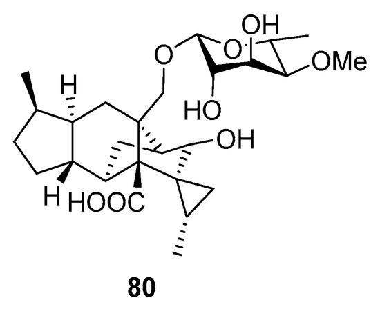 A new sordarin derivative, trichosordarin A (80), with a unique norditerpene aglycone, was isolated from Trichoderma harzianum R5 (the Bohai Sea). Compound 80 (Figure 7) was toxic to Artemia salina, but it appeared to only weakly inhibit Amphidinium carterae and Phaeocystis globosa [53].