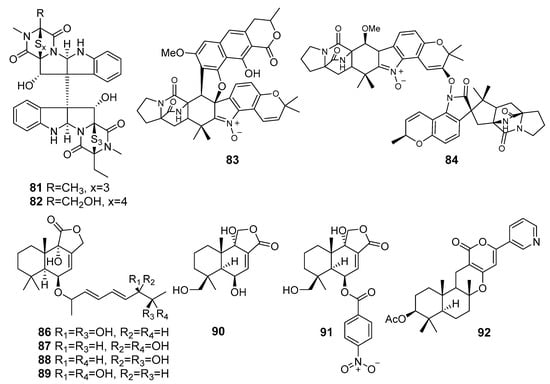 Two new epipolythiodiketopiperazines, named chetracins E (81) and F (82) (Figure 8) were isolated from the fungus Acrostalagmus luteoalbus HDN13-530 (Liaodong Bay, the Bohai Sea). All the compounds exhibited strong cytotoxicity against the five cancer cell lines. The computational docking indicated that compounds 81 and 82 could bind to the C-terminal of heat shock protein 90 (Hsp90), which was in line with the experimental observation of decreases in levels and active forms of Hsp90 client proteins [57].
