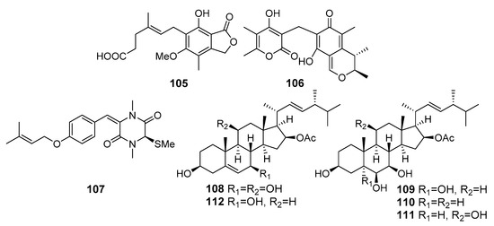 New ergostanes, penicisteroids E (108), G (109) and H (110), together with known related penicisteroids A (111) and C (112) were isolated from Penicillium granulatum MCCC 3A00475 (Antarctica). Compounds 108–112 showed moderate antiproliferative effects selectively against 12 different cancer cell lines. Compounds 109 and 112, potent RXRa binders with Kd values of 13.8 µM, could induce apoptosis by a retinoid X receptor (RXR)-α-dependent mechanism by regulating RXRα transcriptional expression and promoting the poly-ADP-ribose polymerase (PARP) cleavage. Moreover, they could inhibit proliferation by cell cycle arrest at the G0/G1 phase [73].