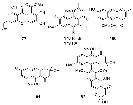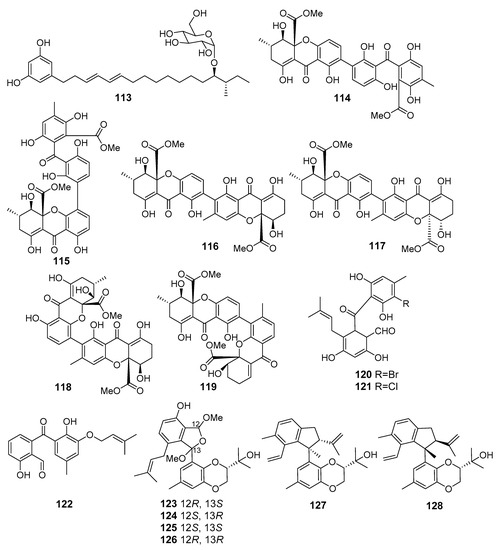 New bis-xanthone derivatives, secalonic acids H–M (114–119) were isolated from Penicillum oxalicum fungus (Langqi Island, Taiwan Strait). Secalonic acids H (114) and I (115) showed a weak cytotoxic effect toward HCT116, KB, and EC9706 cell lines [75], whereas compounds 116–119 exhibited moderate cytotoxicity against HeLa, HCT116, MCF-7, Hep-3B, and A549 cells. Moreover secalonic acid J (116), isolated from Penicillium oxalicum fungus, showed moderate induction of apoptosis in HeLa cells [76].