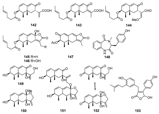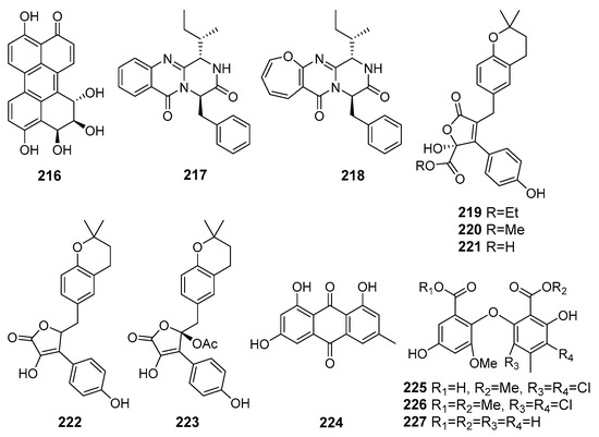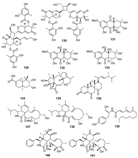Dipleosporalones A (129) and B (130), two new [2+2] azaphilone dimers (Figure 12), were obtained from Pleosporales sp. (coast of Huanghua, the Bohai Sea). Dipleosporalone A (129) possessed an unprecedented skeleton with an uncommon 6/4/6 ring system. Compounds 129 and 130 showed strong activity against human breast cancer MDA-MB-231 and MCF-7, human gastric cancer MGC-803, cervical cancer HeLa, and human lung epithelial carcinoma A549 cell lines [81].