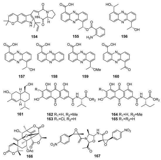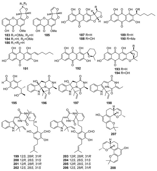 New brevianamide diketopiperazines together with known anthraquinones versicolorin B (24) and averufin (25) were isolated from Aspergillus versicolor MF180151 (the Bohai Sea, China). Compounds 24 and 25 showed moderate activities against S. aureus and MRSA [26].