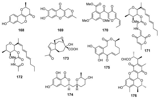 Six new alkenylated tetrahydropyran derivatives belonged to polyketides, designated as (12R,13R)-dihydroxylanomycinol (73), (12S,13S)-dihydroxylanomycinol (74), (12R,13S)-dihydroxylanomycinol (75) and (12S,13R)-dihydroxylanomycinol (76), (12S,13R)-N-acetyl-dihydroxylanomycin (77) and (12S,13S)-N-acetyl-dihydroxylanomycin (78), together with one related known compound lanomycinol (79), were isolated from Westerdykella dispersa (the South China Sea). Compounds 73–79 exhibited moderate antifungal activities selectively against agricultural pathogenic fungi Rhizoctorzia solani, Verticillium dahliae, Helminthosporium maydis, Fusarium tricinctum, F. oxysporum, Botryosphaeria dothidea, and Alternaria fragriae [52].