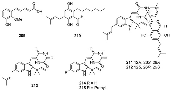 Two new furandione derivatives, asperfurandiones A (67) and B (68) (Figure 6), were isolated from Aspergillus versicolor (Dongji Island, China, the East China Sea). Both these metabolites showed moderate activity against Gaeumannomyces graminis, Cryptococcus neoformans, and Candida albicans [48].