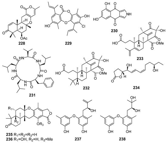 Five new 20-nor-isopimarane diterpenoids, aspewentins D–H (28–32), were isolated from Aspergillus wentii SD-310 (the South China Sea). Compounds 28–32 showed inhibitory activity against the aquatic pathogens Edwardsiella tarda, Micrococcus luteus, and human pathogens Pseudomonas aeruginosa, Vibrio harveyi, and V. parahemolyticus. Moreover, compounds 28 and 31 showed activity against the plant pathogen Fusarium graminearum [29].