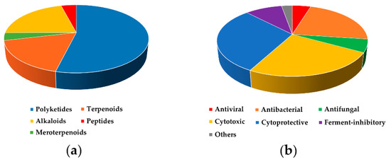 In total, 346 compounds have been described from marine sediment-derived fungi from 2005 till 2015. Antiviral and antimicrobial activity (including sortase A and inhibition of some other enzymes) has been reported for 6 and 24 compounds, respectively. Cytotoxic activity together with cancer-preventive activity and indolamino-2,3-dioxygenase activity inhibition was described for 127 metabolites. At the same time, only nine compounds were reported as anti-inflammatory agents, as well as acetylcholinesterase inhibitors and neuritogenic inductors [10,11,12,13].