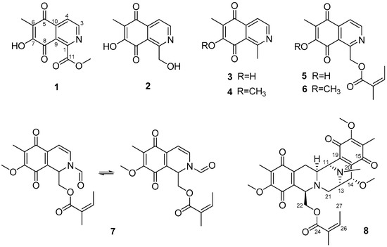 Structures of the isoquinolinequinones (1–8) isolated from Haliclona sp.