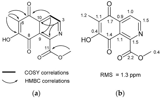 The molecular formula of methyl O-demethylrenierate (1), a pale reddish amorphous powder in methanol, was deduced as C12H9NO5 based on the molecular ion peak at m/z 248.0554 [M + H]+ in the positive HRqTOF MS and the 13C NMR spectra. This molecular formula corresponds to nine degrees of unsaturation. The IR spectrum showed absorption peaks at 3400 and 1732 cm−1, indicating the presence of hydroxy and carbonyl groups. The UV spectrum exhibited absorption bands at 253, 299, and 325 nm. The 1H NMR spectrum showed the only four signals (two doublets and two singlets), whereas the 13C NMR spectrum showed 12 signals, including 1 methyl, 1 methoxy, 2 methines, and 8 non-protonated carbon signals through interpretation of the edited HSQC spectrum (Table 1). The downfield-shifted non-protonated carbons and the degrees of unsaturation suggested that 1 has a planar structure with aromaticity. Based on the HMBC correlations of the methyl proton at δH 2.15 and the two doublet protons at δH 8.06 and 9.04 with non-protonated carbons as shown in Figure 2a, an unassigned carbon chemical shift (δC 179.2), and the carbon chemical shifts of C-1 and C-3 suggested an isoquinolinequinone unit with a hydroxy group at C-7. The carbon and proton chemical shifts for the unit were similar to those of the known renierol, which is an isoquinolinequinone [18]. Additionally, the remaining carbonyl carbon at δH 166.6 was correlated with the methoxy methyl protons at δH 4.08. This carbon did not show any correlation with the isoquinolinequinone, but the connection with C-1 could complete the entire structure of 1. Thus, compound 1 was deduced as methyl 7-hydroxy-6-methyl-5,8-dioxo-5,8-dihydroisoquinoline-1-carbonate. The structure of 1 was confirmed based on the similarity of the carbon chemical shifts calculated using the Density functional theory (DFT) method with MPW1PW91/6-311 + G(2d,p)//B3LYP/6-31+G(d,p), after conformational searching using Merck molecular force field (MMFF). Figure 2b shows the slight differences in the calculated and measured carbon chemical shifts.