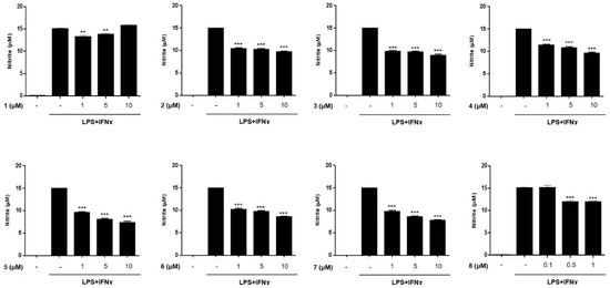 Effects of compounds 1–8 on the production of NO in THP-1 cells activated by LPS + IFNγ. THP-1 macrophages were treated with each compound (1–8) at three concentrations (1, 5, 10 μM for compounds 1–7; 0.1, 0.5, 1 μM for compound 8), followed by LPS (10 μg/mL) + IFNγ (10 ng/mL) were treated. After 24 h of incubation, the concentrations of NO released into culture medium were measured using a Griess assay as described in materials and methods. Results are presented as the means ± SDs of triplicate experiments; ** p < 0.01 and *** p < 0.001 compared to LPS + IFNγ-treated cells. LPS: lipopolysaccharide; IFNγ:interferon-gamma.