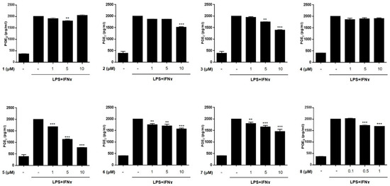 The effects of compounds 1–8 on the production of PGE2 in THP-1 cells activated by LPS + IFNγ. THP-1 macrophages were treated with each compound (1–8) at three concentrations (1, 5, 10 μM for 1–7; 0.1, 0.5, 1 μM for 8), followed by LPS (10 μg/mL) + IFNγ (10 ng/mL) were treated. After 24 h of incubation, the content of PGE2 released into culture medium was measured using ELISA kit. Results are presented as the means ± SDs of triplicate experiments; ** p < 0.01 and *** p < 0.001 compared to LPS + IFNγ-treated cells. LPS: lipopolysaccharide; IFNγ: interferon-gamma.