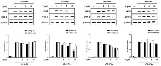 A significant increase in the expression of pro-inflammatory proteins, such as iNOS and COX-2, is observed in the pathogenesis of colitis [20]. Overexpressed iNOS and COX-2 triggers the production of NO and PGE2 in activated macrophages, leading to inflammatory processes [21,22]. To evaluate the efficacy of compounds 1–8 in regulating inflammation in an in vitro intestinal co-culture system, the expression of iNOS and COX-2 was evaluated using Western blotting. Figure 5 shows that the expression levels of iNOS and COX-2 were significantly upregulated by treatment with LPS + INFγ. In cells pretreated with compounds 3, 5, and 7 (1, 5, 10 μM), the induced expressions of iNOS and COX-2 induced by LPS + INFγ were significantly attenuated in a concentration-dependent manner. In cells pretreated with compound 2, only the expression of iNOS was significantly attenuated with no significant changes observed in the expression of COX-2.