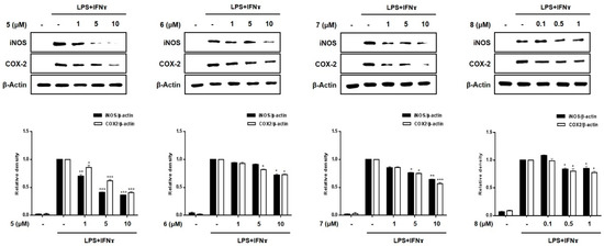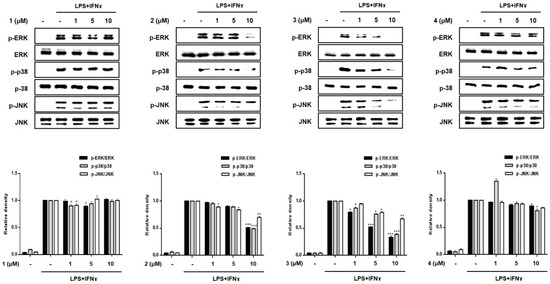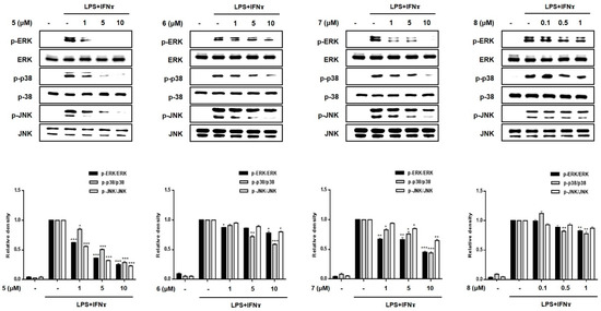 Subsequently, we evaluated the inhibitory effects of compounds 1–8 on the phosphorylation of proteins of the mitogen-activated protein kinase (MAPK) family, including p38, ERK1/2, and JNK (Figure 6). The increased phosphorylation of p38, ERK1/2, and JNK in the LPS + IFNγ-treated cells was inhibited by pretreatment with compounds 3, 5 and 7. In addition, compound 2 also inhibited the phosphorylation of MAPKs at the highest concentration (10 μM). The most significant reduction in p38, ERK1/2, and JNK phosphorylation was observed in cells treated with compound 5.