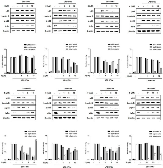 Effects of compounds 1–8 on the nuclear translocation of NF-κB in a co-culture system of Caco-2 cells and THP-1 macrophages. Compounds 1-8 were individually added into the apical compartment, and LPS (10 μg/mL) + IFNγ (10 ng/mL) was added to the basolateral compartment of the Caco-2/THP-1 co-culture model and incubated overnight. Cell extracts were biochemically separated into nuclear and cytoplasmic fractions, and the expression of p65, phosphorylated-p65, Lamin B and IκBα in cells treated with each compound were analyzed using Western blotting. The representative (upper panel) and quantified blots (bottom panel) were obtained after normalization to Lamin B (nucleus) or β-actin (cytosol). Results are presented as the means ± SDs of triplicate experiments; * p < 0.05, ** p < 0.01 and *** p < 0.001 compared to LPS + IFNγ-treated cells. LPS: lipopolysaccharide; IFNγ: interferon-gamma.