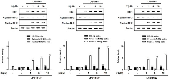 Effects of compounds 3, 5, and 7 on the expression of HO-1 and nuclear translocation of Nrf2 in a co-culture system of Caco-2 cells and THP-1 macrophages. Each compound (1, 5, and 10 μM) was individually added into the apical compartment, and LPS (10 μg/mL) + IFNγ (10 ng/mL) was added to the basolateral compartment of the Caco-2/THP-1 co-culture model. After incubating for 12 and 1 h, respectively, the expression of HO-1 and Nrf2 in cells was analyzed using Western blotting. The representative (upper panel) and quantified blots (bottom panel) were obtained. The representative blot is shown (left panel) and calculated intensities are shown (right panel) after normalization to Lamin B (nucleus) or β-actin (total protein or cytosol). Results are presented as the means ± SDs of triplicate experiments; * p < 0.05 and *** p < 0.001 compared to LPS + IFNγ-treated cells. LPS: lipopolysaccharide; IFNγ: interferon-gamma.