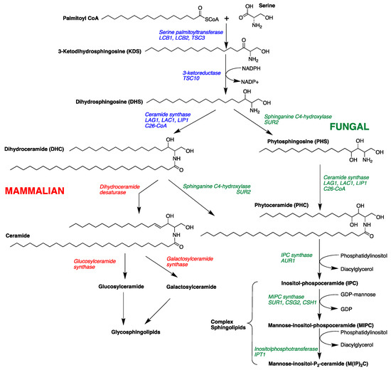 Sphingolipid metabolism in fungal and mammalian cells showing intermediates and enzymes and genes (italics) [30,31].