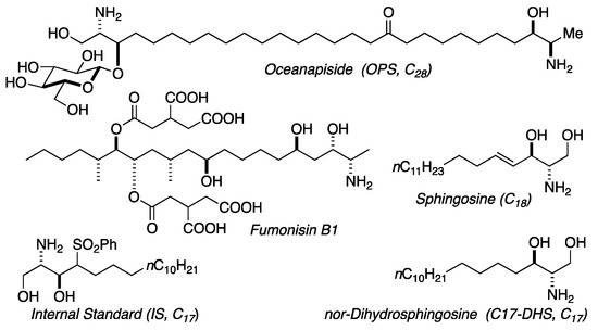 Structures of oceanapiside (OPS), sphingosine, fumonisin B1, and LCMS standards.