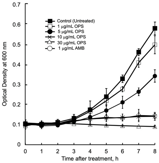 An overnight culture of cells was diluted with fresh SD medium to an OD600 of 0.10 to 0.120, and OPS (1 to 30 μg/mL) was added. The cell culture was incubated at 37 °C, and growth rates were determined by measuring the optical density (OD) at 600 nm as a function of time using a Molecular Devices (San Jose, CA, USA) Spectramax Plus plate reader. An aliquot of the OPS-treated cells was taken hourly, re-plated onto fresh SD agar, and incubated for 24 h at 37 °C to check for cell viability.