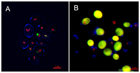 Inhibitory activity of oceanapiside (OPS) against fluconazole-resistant C. glabrata cells using LIVE/DEAD yeast viability kit (Molecular Probes, Eugene, OR, USA). An overnight culture of C. glabrata was incubated at 37 °C in the presence or absence of 10 µg/mL OPS for 2 h. Yeast cells were stained with FUN1 dye and counterstained with Calcofluor White M2R. The cells were viewed with an Olympus IX70 Deltavision microscope using a 60× 1.4 NA objective and a 100 W Hg lamp. A multi-pass filter set with the following excitation wavelengths were used: λ 360, 490, and 555 nm. Metabolically active yeast cells contain (A) red-fluorescent cylindrical intravacuolar structures (CIVS), while dead cells exhibit (B) diffuse yellow-green fluorescence.