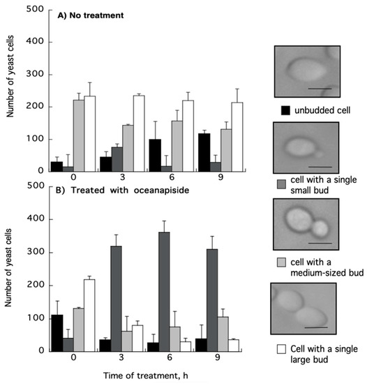 Effect of oceanapiside (OPS) on the proportion of various budding patterns in C. glabrata. Cells were treated in the presence or absence of OPS (10 μg/mL) and samples were taken from each culture at 0, 3, 6, and 9 h of incubation. The cells were classified by their budding pattern, as observed under microscope, as follows: unbudded cells; cells with a single small bud; cells with a medium-sized bud; and cells with a large bud. Values are means and standard deviation of the three experiments. Scale bar, 3 μm.