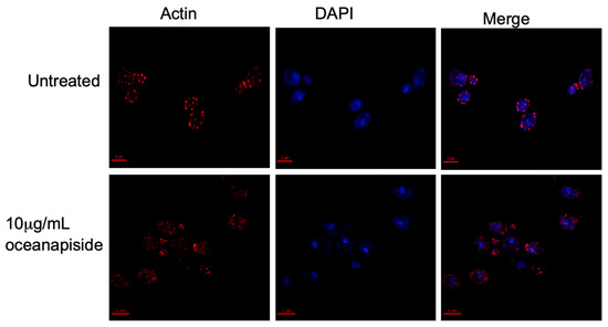 The effect of marine natural products on the organization of actin assembly was determined by using fluorescent probes to visualize the actin cytoskeleton. Briefly, a 100 μL of an overnight culture of C. glabrata was transferred to 1 mL of fresh SD medium and incubated at 37 °C to low log (5 × 106/mL). The cell culture was then combined with 10 μg/mL OPS, or 1% DMSO, and incubated for 2 h. After incubation, the cells were fixed in the medium with 4% formaldehyde (methanol free; Ted Pella, Inc., Redding, CA, USA) for 10 min. The cells were harvested (9000 × g for 5 min) and resuspended in 4% formaldehyde for 1 h with frequent mixing, followed by washing (× 2) with phosphate buffered solution, PBS (pH 7.5). The fixed cells were resuspended in 100 µL of PBS and stained with rhodamine-phalloidin, R415 (Molecular Probes, Eugene, OR, USA; 300 units/mL in methanol). The cells were incubated in the dark for 1 h with constant mixing, washed five times with 1 mL PBS, and resuspended in 500 µL of PBS. The mixture was incubated in the dark for 30 min with frequent agitation and washed five times with 1 mL PBS. Rhodamine-phalloidin stained cells (2 μL) were immobilized between a clean glass slide and cover slip for microscopic examination.