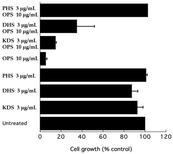 To further test the effect of OPS on sphingolipid biosynthesis, a growth inhibitory assay was performed in the presence of long-chain bases (LCBs) to test the efficiency of the latter compounds as competitors to rescue cells from inhibition by OPS. A growth inhibitory assay was conducted using ketodihydrosphingosine (KDS), dihydrosphingosine (DHS), and phytosphingosine (PHS) as exogenous sphingoid bases. At 3 μg/mL, KDS, DHS, and PHS were slight inhibitory to C. glabrata (Figure 8). However, when added to OPS, these three sphingoid bases showed different effects. The KDS showed no effect on the antifungal activity of OPS. DHS partially reversed the antifungal activity of OPS, showing a 35% cell growth. However, the cells were not viable after 24 h of treatment. In the presence of phytosphingsosine, the antifungal activity of OPS was completely eliminated. Cultures treated with OPS and phytosphingosine showed > 99% cell growth and these cells were viable after 24 h of exposure.