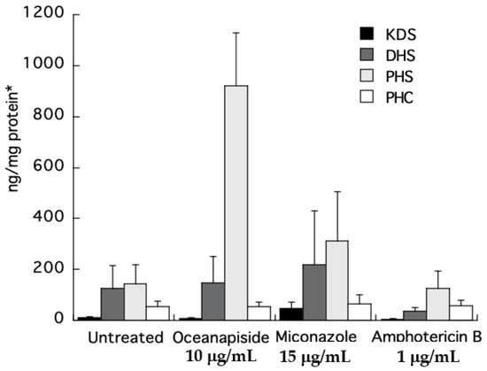 LC-ESI-MS quantification of sphingolipid metabolites obtained from the crude extracts of C. glabrata cells treated with oceanapiside, miconazole, and amphotericin B using positive Electrospray Ionization (ESI )and selected ion monitoring (SIM; per ng/cell protein). Error bars indicate the standard error of three experiments. *Absolute protein content of each treatment was found to be in the same range (ca 2 mg/100 μL cell lysate).