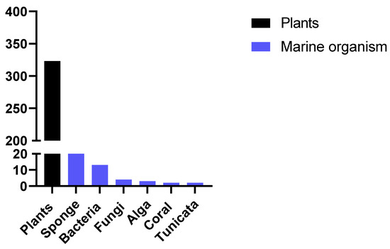 After this detailed review of the articles reporting the activity of compounds from marine sponges, we made a brief survey of data in the literature to compare the number of articles published reporting the activity of marine organisms with the number of articles published reporting the activity of extracts from plants. To do so, the following combinations of keywords were used: "new antimalarials and plants" or "new antimalarials and marine" and selected the works published in the last 10 years. Figure 2 represents the number of studies reporting antiplasmodial activity of new compounds found. The search for new compounds from marine sources is still uncommon compared to the search for natural products from plants. Other recent reviews have also reported this comparison, which reinforces the importance of seeking new products from marine sources, especially considering that the diverse nature of metabolites produced by these alternative sources presents a compelling case for intensive exploration [56].